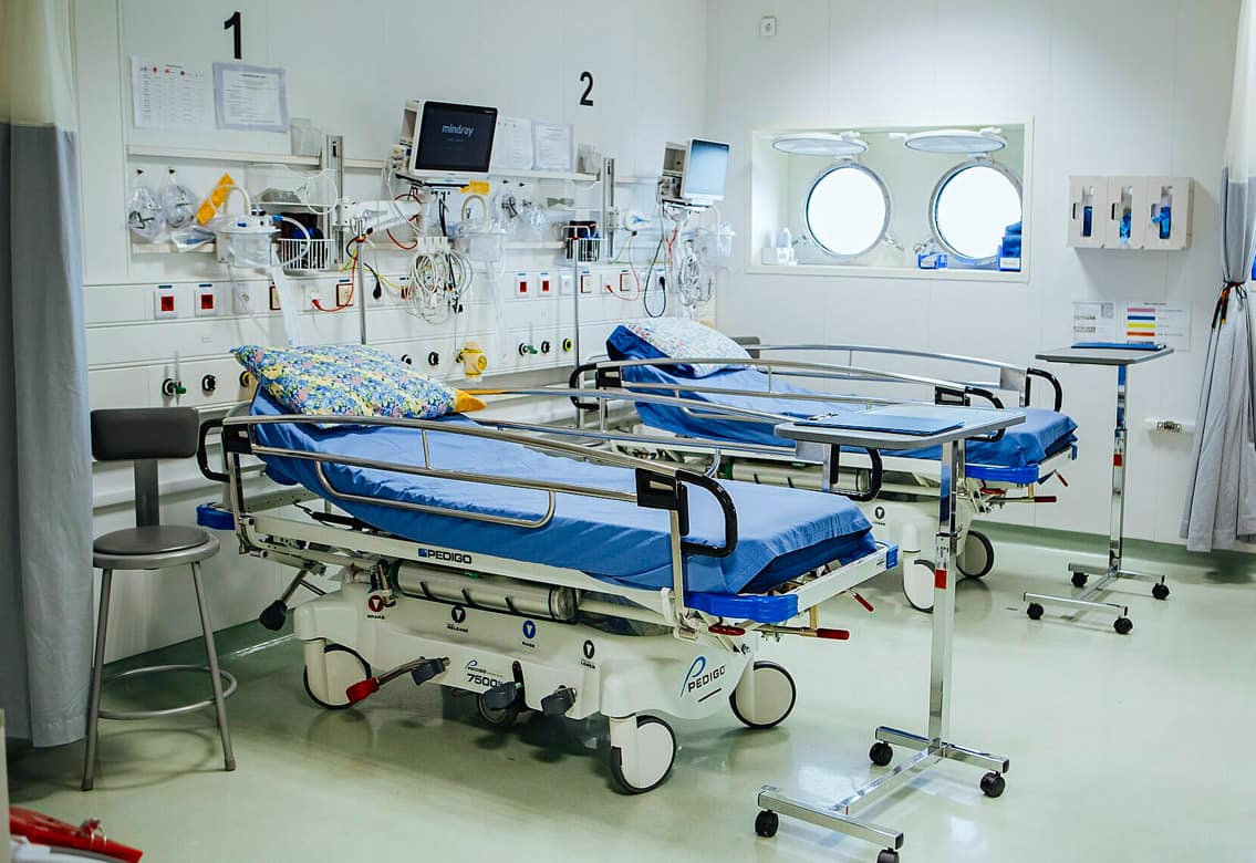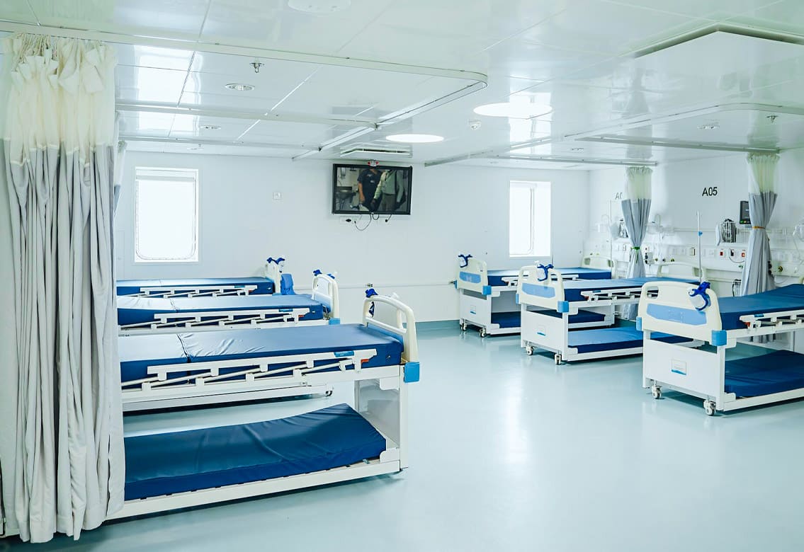The hospital covers most of decks 3 and 4 – approximately 7,000 square metres containing supply services, 6 operating theatres, 102 acute care beds, 7 ICU/isolation beds and an additional 90 self-care beds. The hospital area includes dedicated classroom/conference spaces as well as simulator labs for more effective training.